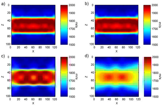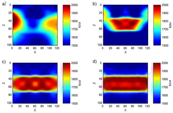 Velocity inversion results for the four different source-receiver distributions; (a–d) correspond to the source-receiver distribution statuses in Figure 9a–d, respectively.
