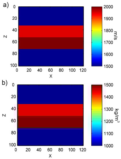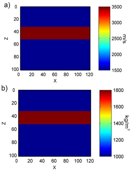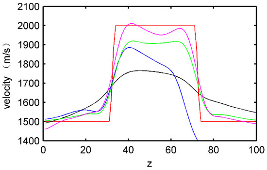 There are many waveform inversion methods (e.g., the steepest descent method [25], conjugate gradient method [26], Gauss–Newton method [27,28], and quasi-Newton method [29]). Most methods require certain constraints and assumptions. Some require good background values, some are only effective for horizontal medium models, and some have excessive iterations and cumbersome calculations, while others are at the theoretical research stage and do not have good numerical simulation results. In this study, the authors used the Gauss–Newton method based on symmetric nonlinear equations combined with regularization and the least squares method for bone quantitative ultrasound imaging. The residual between the forward wave field and the observed data were used for back-propagation in the medium so that the parameter values at every point in the model were corrected through the inversion symmetry. Therefore, a real model can be inversed, even without a priori estimation of the model. This method has good stability and uses a smaller number of iterations compared to gradient methods.