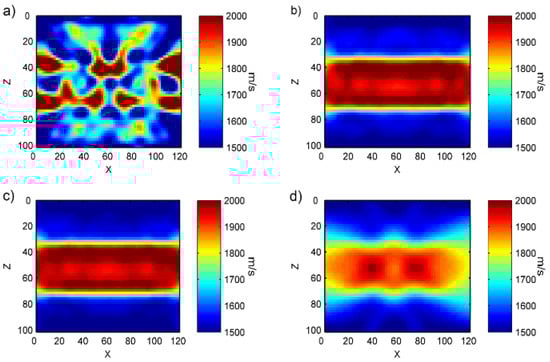Figure 10 shows the velocity inversion results for four distribution types. In Figure 10a, the velocity distribution of cancellous bone in Figure 7 can hardly be seen, which is a failure of inversion. The main reason for this is insufficient wavenumber coverage range. The inversion image in Figure 10b is a little similar to the objective model while the inversion results at the top half are better than the bottom half. This is because the sources and receivers are mostly located at the top half of the model while the velocity parameters at the bottom half of the inversion results were hardly updated and have a larger overall error. In Figure 10c, the velocity result at the bottom half is getting better because the coverage ability in the vertical direction are strengthened. The inversion results for Figure 10d are the best since they effectively reflect the velocity parameters for the objective model. This shows that the receivers at the bottom half have compensated for the insufficient diffraction angle in the top half. Figure 11 shows the comparison of the velocity inversion results of the four graphs in Figure 10 with the velocity of the objective model. In Figure 11, the x-coordinates represent the number of grid points in the vertical direction while the y-coordinates represent the mean velocity of every row. In this figure, we can see that when the receivers are located at the two sides of the model, the inversion velocity and objective model velocity have the smaller errors, followed by when the sources and receivers are both located on the top surface. Under these conditions, the variation pattern of density is the same as the velocity, which will not be elaborated here. The velocity inversion results were used only as a reference.
