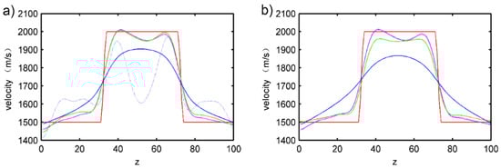 Comparison of inversion velocity and objective velocity under different source-receiver quantities. In (a), the red lines represent the velocity of the objective model, and blue dotted, green, magenta, and blue solid lines represent the mean values for each row of inversion velocity under the four source distributions in Figure 12a–c, respectively; In (b), the red lines represent the velocity of the objective model, and blue dotted, magenta, green, and blue solid lines represent the mean values for each row of inversion velocity under the four receiver distributions in Figure 13a–d, respectively. Figure 12c and Figure 13b has the same distribution status.