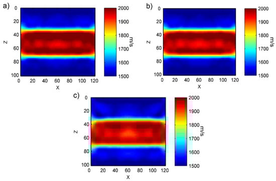 Velocity inversion results under different time sampling rates in forward simulation data. (a) Data are extracted every 2 time steps for participation in the inversion algorithm. (b) Data are extracted every 4 time steps for participation in the inversion algorithm. (c) Data are extracted every 8 time steps for participation in the inversion algorithm.