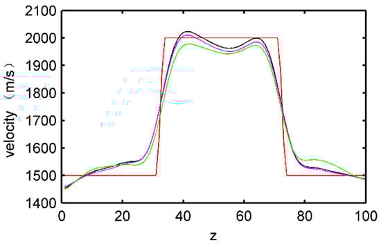 Comparison of inversion velocity and objective velocity under different time sampling rates. In the figure, the red lines represent the velocity of the objective model, and black, magenta, and green lines represent the mean values for each row of inversion velocity under the three different time sampling rates in Figure 15a–c, respectively.