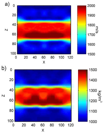 As shown in Figure 6, the velocity for the cancellous bone layer is set as 2000 m/s, and density is set as 1500 kg/m3. The velocity for the surrounding soft tissues and couplant is set as 1500 m/s, the density is 1000 kg/m3. Figure 7 shows the inversion results.