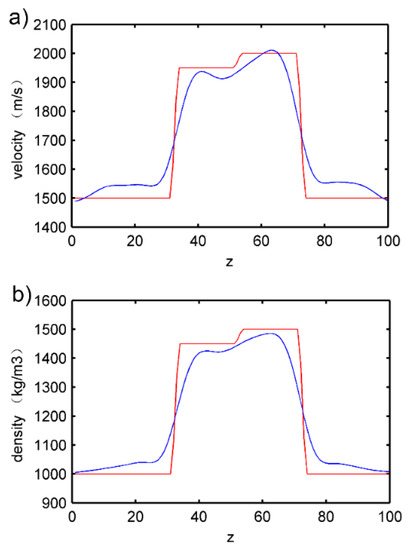 Forgues and Lambare [36] used ray-approximation and Born-approximation conditions to derive the mathematical expression of the corresponding radiation modes for velocity and density parameterization in a variable-density acoustic wave equation; eigenvalue decomposition analysis of the Hessian matrix was used to show that density inversion is more difficult than velocity inversion. In a 2013 paper, Dong et al. [37] analyzed the relationship between the perturbations of different model parameters and changes in objective function and found that perturbations by long waves in velocity will severely interfere with the density inversion results. One proposed solution is to first carry out large-offset velocity inversion to obtain the medium and long wavelength component in velocity before carrying out simultaneous velocity and density inversion. However, this method cannot avoid the influence of high-frequency components of density on velocity inversion.