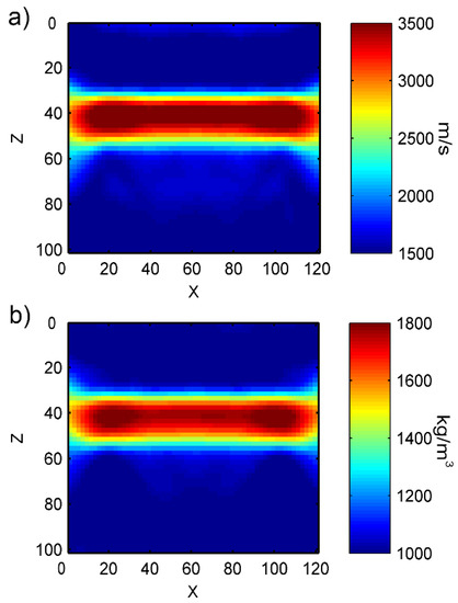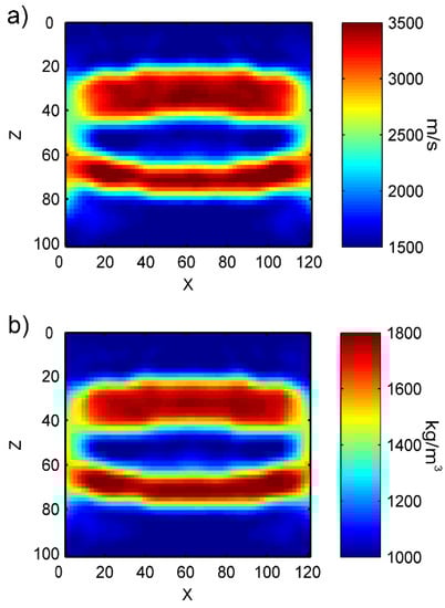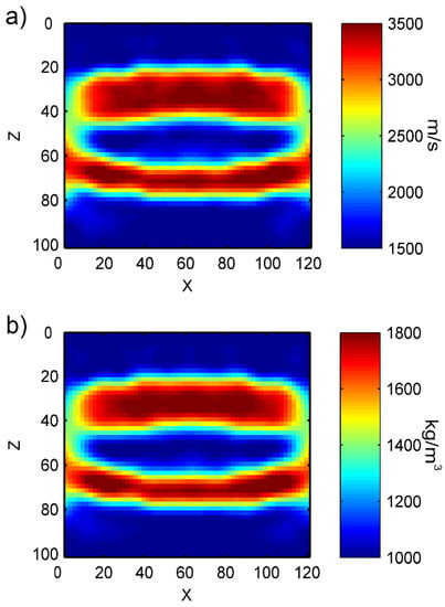 Inversion results of the long bone middle segment: (a) velocity model; (b) density model.
