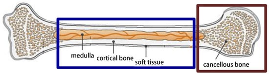 In Figure 22, we can see that long bones are mainly composed of cortical bone, cancellous bone, medullary cavity, epiphysis, and periosteum. Based on differences in the velocities of ultrasonic waves in different parts of long bones, we can obtain the geometric distribution of long bone velocity and density parameters using FWI, thereby obtaining the internal structure of long bones and calculating their BMD. We divided the long bone into two segments and designed the objective model as shown in Figure 23.