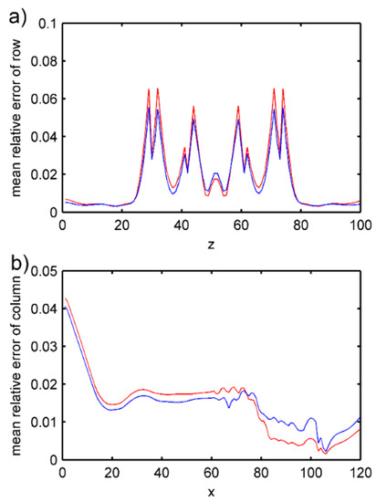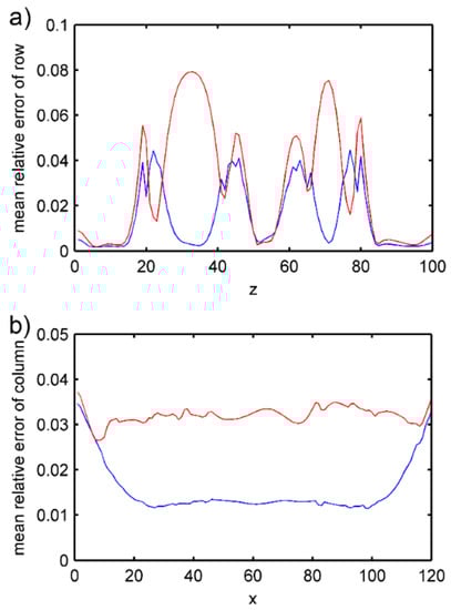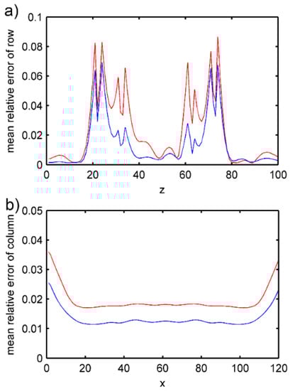 Mean relative error between the inversion model and objective model of the long bone end segment. Red shows the error between velocity parameters and blue shows the error between density parameters (a) mean relative error of row; (b) mean relative error of column.