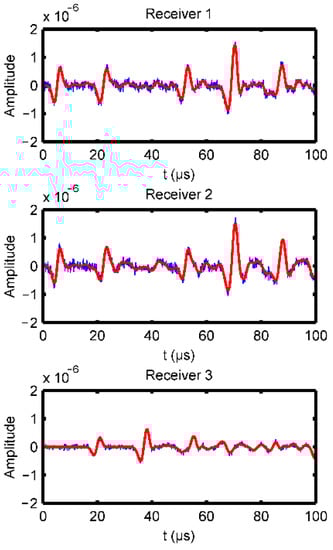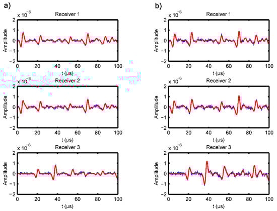 Forward records of different receivers, red line is the record with no noise, while blue line is the record with 10% Gauss noise: (a) middle segment model of long bone; (b) end segment model of long bone.