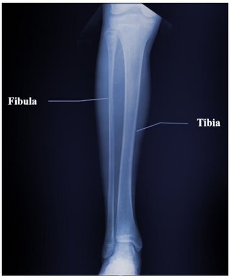 The tibia is an important bone in the calf that supports the weight of the body while the fibula is attached to the calf muscles and bears one-sixth of body weight. The two bones are connected as one by the superior tibia–fibula joint and the inferior tibia–fibula joint, and they are important bones in human BMD measurements. As shown in Figure 30, we selected a segment in the middle of the tibia–fibula pair as an objective model to better validate the extensiveness of our modified FWI algorithm. The approximate objective model is as follows: