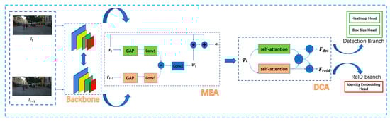 Pipeline of the Motion and Correlation-Multiple Object Tracking (MAC-MOT) framework. The adjacent frames, and , are fed to the backbone to obtain the multi-scale features. Then, the motion-enhanced attention module (MEA) makes the objects’ motion feature more prominent. The dual correlation attention module’s (DCA’s) disassembly feature makes it more suitable for different tasks. * represents the element-multiplication. Ultimately, the detection branch outputs the locations and embedding features of the objects.