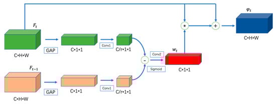 The operator represents the sigmoid function, which is used to normalize the values of the weights to 0–1. We utilize channel-wise multiplication to enhance the motion-salient features .