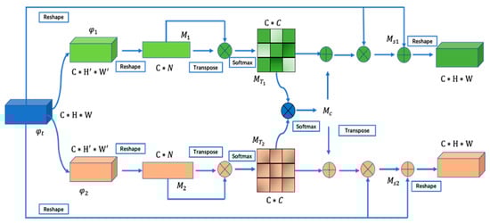 The structure of our dual correlation attention module is presented in Figure 3. The feature , which is the output of the MEA module depicted in Figure 2, is split into two branches through two convolutions of the same structure with a kernel size of . The outputs are denoted by and . Following the convolution, a reshape operator is implemented. Specifically, and are then reshaped to and . The reason for this reshaping operation is due to a dimension matching in doing the matrix multiplication computation. As a result, the spatial two-dimensional distribution of the feature map is transferred to a one-dimensional distribution, where . Subsequently, we perform the matrix multiplication on or and its corresponding transpose. A row softmax function is exploited to obtain the self-attention weight maps and for each task. Again, we perform the matrix multiplication between and to learn the commonalities between the different tasks, and then a row softmax is followed to generate the correlation attention weight maps . is added to and , aiming to get the enhanced representation, denoted by and . The enhanced representations are fused with by the attention to prevent information loss.