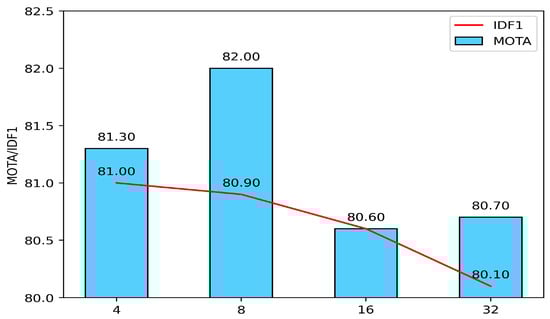 There is a feature dimension conversion coefficient r in the MEA module, which reflects the degree of the feature aggregation. In order to find the suitable parameters, we conducted experiments on the MOT17 verification set. As shown in Figure 4, we chose four values of r: 4, 8, 16, and 32. We find that the MOTA is the highest when r is 8, and the IDF1 continues to decrease as r increases. Here, we conclude that with the current experiment settings, the hyperparameter r equaling to 8 provides the best performance.