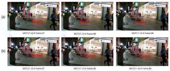 (a) demonstrates the tracking performance of FairMOT [24]; (b) represents the tracking performance of MAC-MOT.
