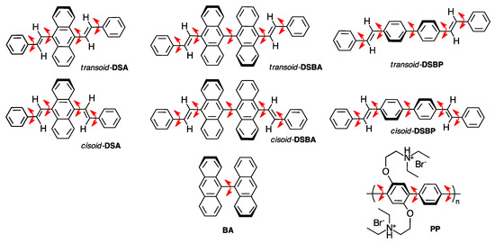 Chemical structure of luminophore rotamers. The arrow in red represents the labile rotation axis. DSA, DSBA, and DSBP show less-polar transoid and polar cisoid vinylic conformers.