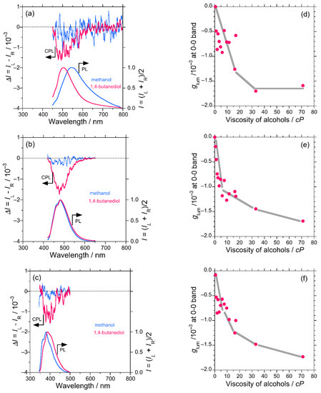 Comparison of the CPL and photo-luminescence (PL) spectra in methanol and 1,4-butanediol for DSA excited at 420 nm (a), DSBA excited at 390 nm (b), and DSBP excited at 320 nm (c). The glum values at 0-0 PL band extremum of DSA (d), DSBA (e), and DSBP (f) as a function of the viscosity of alcohol, respectively: methanol (0.55 cP), ethanol (1.09 cP), n-propanol (1.96 cP), n-butanol (2.59 cP), n-pentanol (3.47 cP), n-hexanol (4.59 cP), n-heptanol (5.97 cP), n-octanol (7.59 cP), n-nonanol (9.51 cP), n-decanol (11.50 cP), ethylene glycol (16.1 cP), n-undecanol (16.95 cP), 1,3-propandiol (33.0 cP), and 1,4-butanediol (71.0 cP) [42,43].