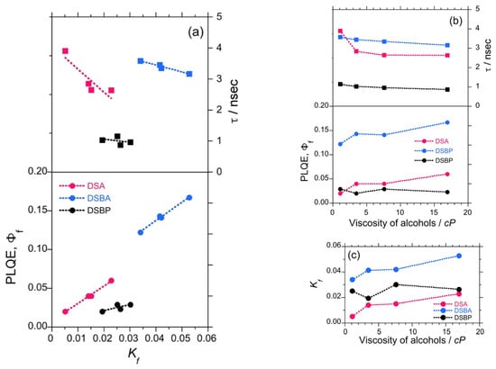 Relationships between radiative decay rate (Kf), photoluminescence lifetime (τ), and quantum yield (Φf) of DSA (red filled circles and squares), DSBA (blue filled circles and squares), and DSBP (black filled circles and squares) (a), the relationship between Φf, τ and the viscosity of four alcohols (b), and the relationship between Kf and the solvent viscosity (c). The solvents are ethanol 1.19 cP (25 °C), n-pentanol 3.47 cP (25 °C), n-octanol 7.59 cP (25 °C), and n-undecanol 16.95 cP (25 °C)) [48,49].