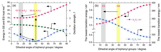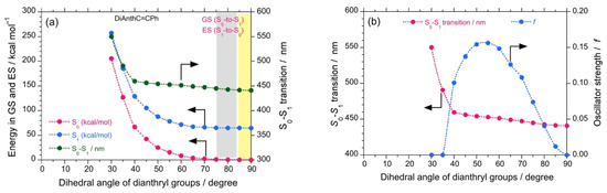 Further, the plot of the dihedral angle vs. the lowest transition energy (eV, nm) reveals a change in the lowest transition energy from 3.54 eV (349 nm) at GS to 3.39 eV (362 nm) at ES, which also complements the experimental observations of a large Stokes shift (from 330 nm to 393 nm, ~4850 cm−1 or 0.60 eV) (Figure 3b). Similarly, DSBA possesses a bianthryl core; its twisted states were generated hypothetically by varying the dihedral angles of bianthryl core from 30°–90° with an interval of 5° while keeping the dihedral angle of styryl groups optimized (~53°). By employing these twisted structures, single-point energy calculations were performed using DFT and TD-DFT (B3LYP, 6-311G).