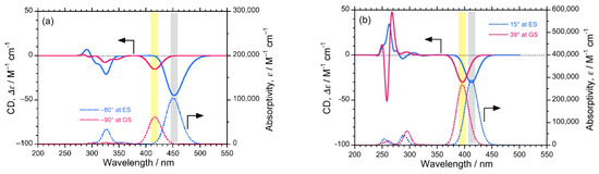 The plots of energy at GS and ES as a function of the dihedral angle of biphenyl core revealed that DSBA remains at GS with a dihedral angle of 90.07° and subsequently adopts a conformation with a dihedral angle of ~80° at ES. The energy profile reveals a much higher energy barrier for intra-molecular rotation as compared to DSBP, which increased exponentially with a decrease in the dihedral angle of bianthryl core. Therefore, only a small intra-molecular reorganization could be observed from GS to ES (Figure 4a). Further, the f value as a function of the dihedral angle showed an increase in f from GS (0.00079) to ES (0.04063) owing to the small intra-molecular reorganization due to a large rotational barrier (Figure 4b). As a result, when the viscosity of the solvent was increased, consistent increases in Φf and Kf values of DSBA were observed, associated with the decrease in τ value. This tendency is significantly supported by the corresponding (–)-sign CPL signals.
