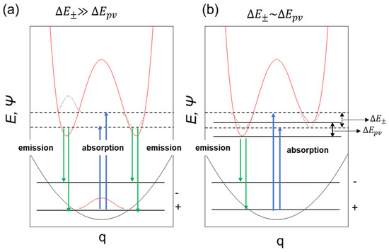 A schematic model of symmetrical double-well (a) and dis-symmetrical double-well in the photoexcited state (b) coupled with single well in the ground state.