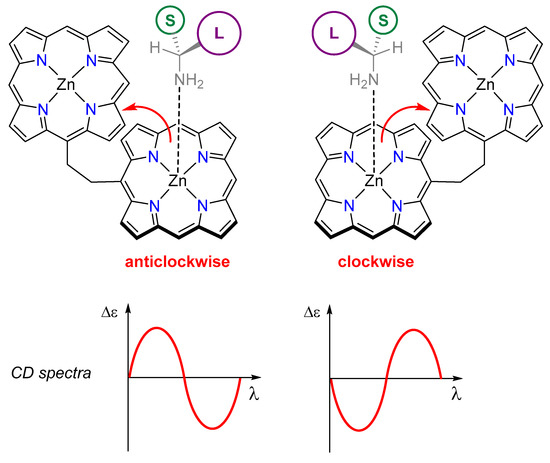 Schematic representation of complexes of bis(ZnOEP) with both enantiomers of a chiral amine and the corresponding CD signal induction. Ethyl substituents in bis(ZnOEP) are omitted for clarity. “S” and “L” denotes small and large substituents in a chiral amine guest, respectively. See [30,31,32] for the experimental CD spectra.