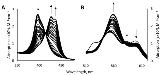 Changes in UV-Vis spectrum of bis(ZnOEP) (3.34·10−6 M, CH2Cl2, 293 K) caused by portion-wise addition of BTI (0–1.79 × 10−3 M). (A) Soret-Bands region (B) Q-Bands region.