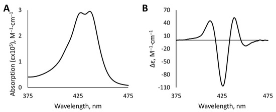The UV-Vis and CD spectra were simulated using the Gaussian16 [61] software and TD-DFT method [62,63,64]. For spectra simulations, the ωB97X-D functional [65] and cc-pVDZ basis set [66,67,68] with the SMD solvent model [69] were used, since this level of theory showed good agreement with experimental data [56,57,70]. The first 10 excited states were calculated in order to ensure that the B band region of the spectrum was covered. The corresponding data are given in the Supplementary Materials.