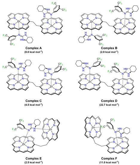 To explain the differences in the calculated and experimental spectra, we assumed that the experimental spectrum represents the combined contribution of various conformers or even differently organized host-guest complexes. We attempted to define these species, since X-ray analysis usually defines only the most energetically favorable conformer. In addition to the lowest energy conformer A (which also dominates in the solid-state, according to X-ray analysis), three 1:2 complexes (B–D) differing by the spatial orientation of the guest molecules and two 1:1 complexes differing by the coordination mode to the second porphyrin moiety were built and their geometries were fully optimized. The calculated Gibbs free energies of these complexes are presented in Figure 7. In the complex B, two BTI molecules are placed asymmetrically at the opposite sides of the bis(ZnOEP) host. In the complexes C and D, the guests are located at the same side of bis(ZnOEP); however, both BTI molecules are facing each other either by the octahydrobenzo[d]imidazole fragments (complex C) or by the bis(trifluoromethyl)phenyl fragments (complex D). In addition to 1:2 complexes, two possible 1:1 complexes with clockwise and anticlockwise positions of two porphyrin subunits were also modelled. In the 1:1 complexes E and F, the host–guest interaction occurs via a two-point coordination mode in a tweezer fashion by placing the BTI molecule between two porphyrin moieties. As the most plausible binding modes, the corresponding tweezer conformation is fixed either by simultaneous coordination of two nitrogens of BTI with two zinc ions of bis(ZnOEP) (complex E) or by interaction of imino nitrogen and one fluorine atom of the CF3 group with zinc ions of bis(ZnOEP) (complex F, Figure 7). All of the corresponding energies and geometries are given in Table S3 and Geometries.xyz (see the Supplementary Materials).