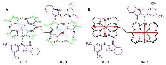 In order to understand the differences with the experimental data, porphyrin geometries obtained from the crystal structure and optimized in solvent were compared and two major distinctions were found. In particular, one of the porphyrin planes is more deformed, with the Cβ-Cβ-Cβopp-Cβopp dihedral angles being 18.1° and −15.2° (optimization in solution) and 9.4° and −9.3° (crystal structure), and porphyrin planes are shifted in respect to each other by 17.0° (based upon the Zn-Cmeso-Cmeso-Zn dihedral angle), as compared to the crystal structure geometry (Figure 8A and Table 1). Additionally, it turned out that solvation plays an insignificant role, resulting in the minor conformational changes found for the complexes optimized as in the gas phase and in CH2Cl2. For example, in the complex optimized in a gas phase, the Zn atoms became a bit closer to the average porphyrin planes (N-Zn-Nopp angle), but the Cβ-Cβ-Cβopp-Cβopp and Zn-Cmeso-Cmeso-Zn dihedral angles remained almost unchanged. Therefore, it was reasonable to conclude that the differences observed between CD spectra, calculated using the geometries optimized in solution, and the crystal structure are attributed to altering the spatial position of the two porphyrin units. Indeed, it is known that the CD spectra of bis-porphyrins are highly sensitive to the orientation of porphyrin rings relative to each other [30,31,32]. Furthermore, it was previously established that the CD amplitude has a parabolic-like dependence on the dihedral angle between the coupling electronic transitions, with zero values at 0° and 180° and a maximum value at around 70° [81]. In the case of the porphyrin chromophores, there are two B electronic transitions orientated along the corresponding meso (5–15 and 10–20) positions (Figure 8B) and any directional deviation from the coplanar conformation makes these transitions optically active. In the crystal structure, both porphyrin planes are situated almost on the same line, with the dihedral angle Zn-Cmeso-Cmeso-Zn being 179.0°, which can be attributed to a slight anticlockwise orientation. In the structure optimized in dichloromethane, two porphyrin planes are orientated clockwise, with the dihedral angle Zn-Cmeso-Cmeso-Zn equaling −163.5°.