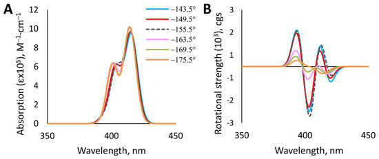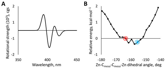 In turn, the energy scan showed that the potential energy surface is flat and continues for the range of −167.5° to −151.5°, with the energies varying within just 0.4 kcal mol−1 (Figure 9B and Table S4, see the Supplementary Materials), which makes difficult to determine the exact minimum. Nevertheless, the minimum found by the geometry optimization process (and confirmed by frequency calculations) corresponds to the dihedral angle of −163.5° and it is 0.2 kcal mol−1 higher than in the case of the complex with the dihedral angle of −155.5°. Such a small energy difference is within an accuracy error of the DFT method and could be a result of the numerical noise. Therefore, it is plausible to assume that the Zn-Cmeso-Cmeso-Zn dihedral angle of bis(ZnOEP) complex in solution is about −155.5°, since the UV-Vis and CD spectra of this structure (Figure 10) has the best match with the experimentally measured spectrum (Figure 4). All other simulated spectra are presented in Figure S4, see the Supplementary Materials.