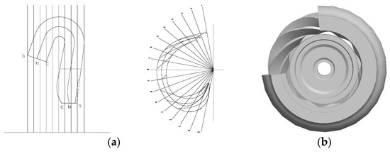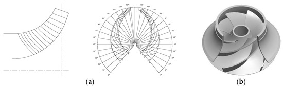 Impeller: (a) hydraulic structure chart; (b) 3D model of second-stage impeller.
