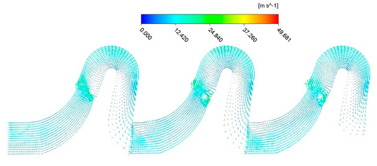 Figure 6 shows the velocity distribution in the meridian plane of the impeller and channel-diffuser under design flow rate of 850 m3/h. As can be seen from Figure 6, the velocity distribution in the first-stage impeller is uniform and stable. However, a vortex appeared at the connection of impeller outlet and diffuser inlet. The vortex generated at the connection and was distributed along the inner streamline. Then the vortex developed towards the interior of the channel-diffuser and eventually the entire vortex formed in the inlet of the channel-diffuser, which nearly extended to the transition section of the channel-diffuser blade. There was no visible vortex on the outer streamline. There were still some vortices existing in the connection between second-stage impeller and channel-diffuser, and there were two vortices in the impeller and the channel-diffuser. The distribution of vortices in the second-stage channel-diffuser was similar to that in the first-stage channel-diffuser, but the vortices in the second-stage channel-diffuser were larger, which extended to the outer streamline. The vortex inside the impeller was generated close to the inner streamline of the impeller, which corresponded to that inside the channel-diffuser. The flow pattern in the connection of the third-stage impeller and channel-diffuser was the same as that in the previous stage. The difference is that the generation of the vortex was more serious and the area was larger. At the connection between the channel-diffuser and the next-stage impeller, the vortex and the separation flow generated on outer streamline in the inlet of the impeller.