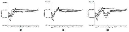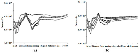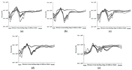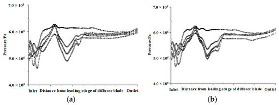 Pressure distributions on the first-stage channel-diffuser blade surface facing upstream impeller with different inlet angles are plotted in Figure 7. At the inlet of the first-stage channel-diffuser, fluid transits from impeller to channel-diffuser. The pressure curve fluctuates for the first time because of the impact action. Then, the fluid flows in the inlet section of the channel-diffuser, and the pressure rises slightly. When the fluid passes through the transition section, the energy conversion process is unstable due to the change of the direction of the medium flow, resulting in the second pressure wave. When the fluid flows into the outlet section of the channel-diffuser, the pressure returns to be smoothly again.