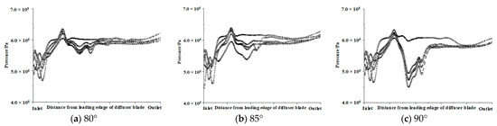 Figure 9 shows the pressure distributions on the first-stage channel-diffuser blade surface facing upstream impeller with different outlet angle. The pressure variation of outlet angle of 90° was significantly lower than that with outlet angle of 80° and 85°. Although there was an abnormal fluctuation in the transition-outlet section, the pressure distribution of the five main blades with outlet angle of 90° in the outlet was significantly better than that with the other angles. So, the outlet angle of 90° was chosen.