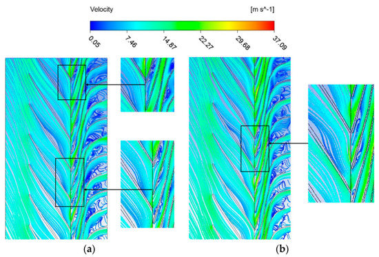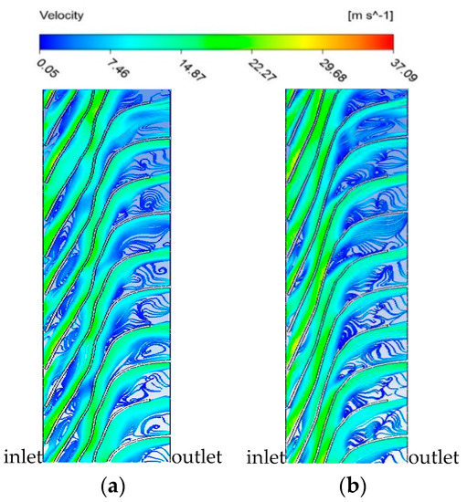 Figure 15 shows the internal flow in the two first-stage channel-diffusers with the different blade outer edge camber lines. It can be seen from Figure 15 that the effect of uniform transition lines is better than non-uniform transition lines in the transition of whole blade outer edge camber lines. The uniform transition outer edge camber lines can play a good role in stabilizing the fluid flow. In the transition section, there is no generation and development of vortex. However, in the model with non-uniform transition lines, the vortices appear in the initial position of the transition section, but it does not spread to the whole transition section. It can be seen that the diffuser design with the non-uniform transition outer edge camber lines has a certain effect of stabilizing fluid flow. However, the effect of stabilizing the fluid flow in the diffuser with non-uniform transition outer edge camber lines is reasonably lower compared to the diffuser with uniform transition outer edge camber lines.