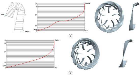 The inlet of the channel-diffuser as the matching object was chosen to establish the matching relationship between the impeller outlet and diffuser inlet, which reduces the vortex and improves the flow regime. For this, two types of blade inlet shapes of diffusers were established (shown in Figure 11). (1) Twisted inlet of diffuser. The inlet section of the diffuser and the impeller outlet are distorted in order to reduce the interference between the impeller outlet and diffuser inlet. (2) Diffusion inlet of diffuser. The inlet section of the diffuser is parallel to the impeller outlet in order to reduce the vortex generation space.