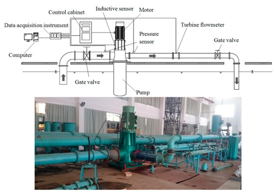 The test bench of the three-stage centrifugal pump, which is the open cycle piping system, is shown in Figure 18. The test equipment mainly includes a triple-phase asynchronous motor, pressure sensors and a turbine flowmeter. The test methods, test accuracy and rules are strictly in accordance with the standard test criteria of P.R. China. In the test, the rotation speed is measured by the inductive sensor. The flow rate of the three-stage centrifugal pump is measured by the turbine flowmeter. The inlet pressure and outlet pressure of the pump are measured by pressure sensors. The power of the pump is measured with the electrical measurement method.