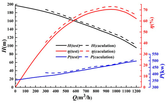 The calculation and test results of the energy performance of the three-stage centrifugal pump are shown in Figure 19. It can be seen from the test results on Figure 19 that when the flow rate is 0 m3/h, head of the pump is 197.08 m. When the flow rate is 850 m3/h, head of the pump is 136.67 m and efficiency of the pump is 69.48%. When the flow rate is 1050 m3/h, head of the pump is 116.85 m and efficiency of the pump is 69.89%.