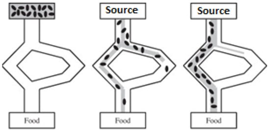 The ant colony optimization proposed by Marco Dorigo et al. [] is a nature-inspired population-based swarm intelligence algorithm, inspired by the foraging behavior of ants in obtaining their food. Ants’ natural tendency is to search out an optimal path between the food source and the ant nest. Ants deposit a chemical, named pheromone, as they move in search of food. A frequently used path will have more pheromone on it, while the amount of pheromone on a less frequently used path will be less. Figure 3 shows the foraging behavior of ants. Ants exhibit stigmergy by depositing pheromone on their trails. The process of adding up the amount of pheromone on a trail is called pheromone reinforcement. This reinforcement is the positive feedback indicating to the other ants to follow the trail. Artificial ants are the counterparts of natural ants. Unlike natural ants, artificial ants possess memory. In addition, to mimic natural ants’ stigmergy, pheromone on the less frequently used trails decreases using the pheromone evaporation process. This evaporation is the negative feedback of the system preventing the other ants from following the trial. Similar to other meta-heuristics, ant colony optimization exhibits both exploration and exploitation. Pheromone evaporation realizes the exploration process, thus avoiding convergence to local optima. Without evaporation, all ants will follow the path left by the first ant without exploring the solution space. Performing a local search of the ants’ current neighborhood window will lead to exploitation, thus working on a current solution to exploit the goodness. In this work, a pheromone enhancement mechanism to determine the current best path was adopted from [] and combined with fuzzy logic for safe path planning. There are many ant colony optimization (ACO) variants, like the ant colony system, elitist ants, ant density model, and so on []. In this work, the ant system was used because of its simplicity and robustness.