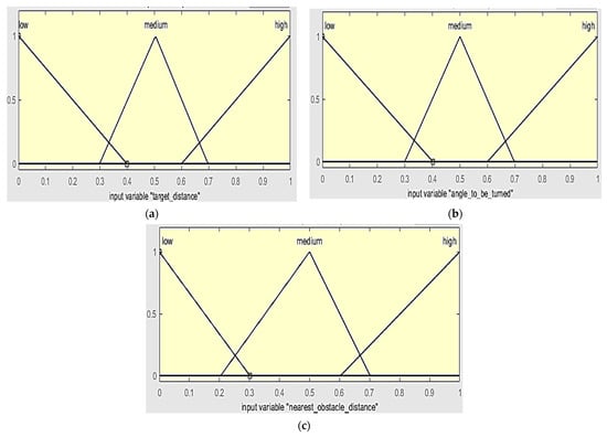 - Fuzzification: the process of transforming a crisp value to a fuzzy value is called fuzzification. This transformation is realized using the membership function. As shown in Figure 1, triangular membership functions are used in this work. Each linguistic variable will have its fuzzy variable values defined in its universe of discourse. The fuzzy variables are characterized by the membership function, with their values in (0,1). In this work, the linguistic variables are relative distance to the target, angle towards the target, and distance towards the nearest obstacle. The fuzzy variable set for each linguistic variable is (low, medium, and high).