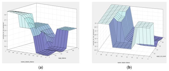In Equation (10), is the fuzzy cost of edge (i, j), and f is the set of parameters defined in fuzzy logic control for collision avoidance. is the pheromone intensity in (i, j) and is calculated by (9) through the backward movement. is defined by Equations (11)–(13). The parameters, f, used in this work are target distance, distance to nearest obstacle, and angle to be turned.