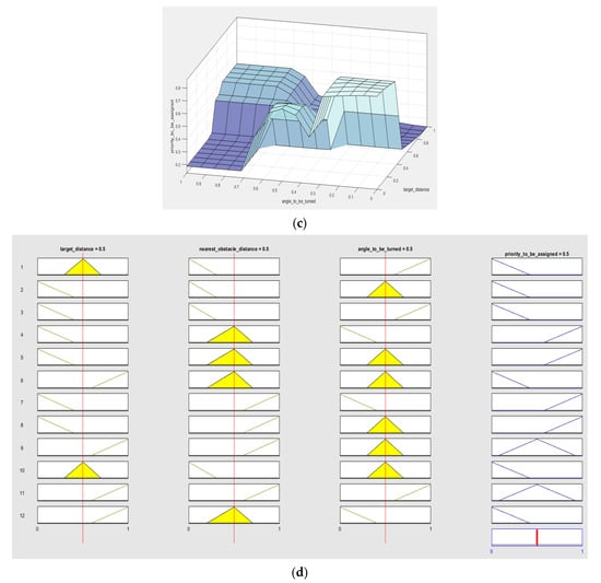 Surface plots of IF...THEN rules of: (a) target distance, obstacle distance, and priority; (b) angle to be turned, obstacle distance, and priority; (c) angle to be turned, target distance, and priority; (d) fuzzy rules characterized using triangular membership function.