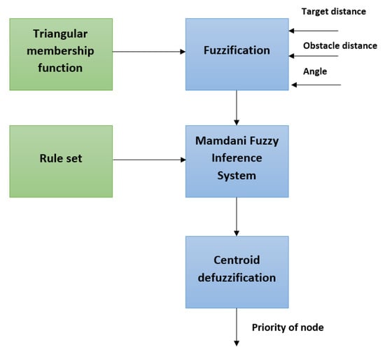 The concept of fuzziness was introduced by Zadeh et al. [] in 1965 as a derivation from a common set. Fuzzy sets, unlike common sets, are those whose elements have certain degrees of membership. Membership refers to the probability of an element belonging to the set. In this work, the triangular membership function was used for path planning.
