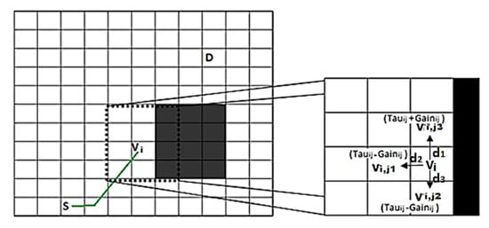 The algorithm begins from S. To proceed further, the algorithm searches for the next node to be visited from (current position). According to the gain-based sigmoid function, the neighbor node with minimum and maximum is marked as the next node to be visited. The corresponding pheromone trail is updated. The gain based local heuristic will enable pheromone enhancement on the local best path. During the pheromone update of ant colony optimization, is added to of ,(considering j3 has minimum ) and subtracted from the of and . Mathematically the procedure can be written as given in Equation (9)