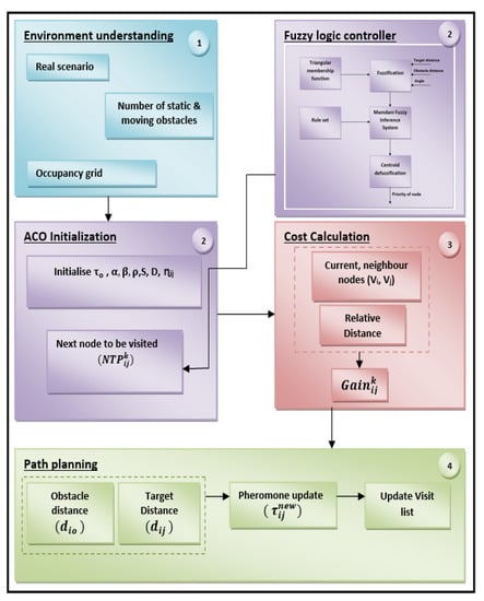 - Purian, F.K.; Sadeghian, E. Mobile robots path planning using ant colony optimization and Fuzzy Logic algorithms in unknown dynamic environments. In Proceedings of the 2013 International Conference on Control, Automation, Robotics and Embedded Systems (CARE), Jabalpur, India, 16–18 December 2013; pp. 1–6. [Google Scholar]