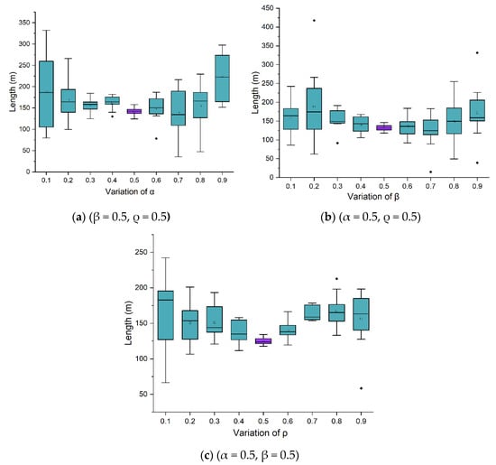 An optimal value for α, β, ρ was essential for the algorithm’s adequate performance since pheromone enhancement is a significant part of FGDACO. The value of α, β, ρ was varied from 0.1 to 0.9, and the results are shown in Figure 10. Figure 10 shows that the variation in length values was the least when α = 0.5, β = 0.5, and ρ = 0.5. Thus, the algorithm is stable with less deviation among its independent runs, and no outliers, when α = 0.5, β = 0.5, and ρ = 0.5.