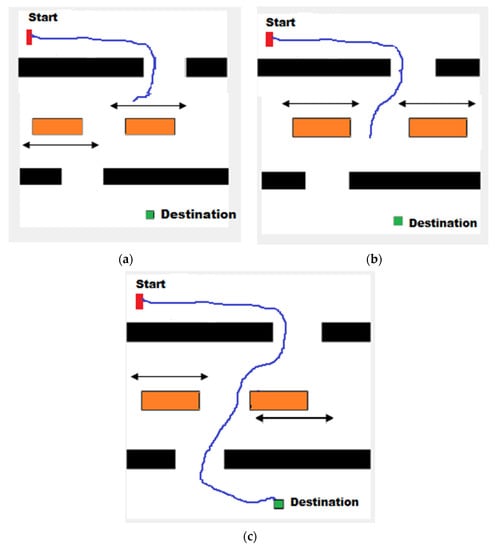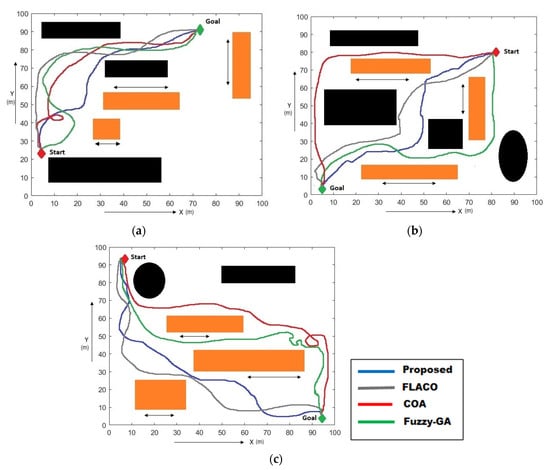 The performance of the FGDACO was compared with existing methods, like the cuckoo optimization algorithm (COA), fuzzy-genetic algorithm (Fuzzy-GA), and fuzzy logic based ant colony optimization (FLACO), in three sample scenarios, with a varying number of obstacles. The performance results in terms of path length and computation time taken are summarized in Table 7. It is evident from Table 7 that, the proposed FGDACO computed the shortest path with minimum time when compared to the others. Moreover, FGDACO was found to be stable, with a minimum standard deviation. In dynamic path planning, one of the essential objectives is to find a collision-free safe path. The mechanism of collision avoidance is illustrated in Figure 11a–c, with sample scenarios. The direction of the moving obstacle (orange color) is shown with the help of directed arrows.