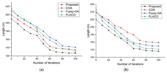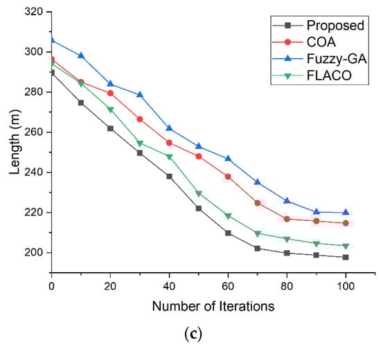 Convergence plots of FGDACO and other existing methods are given in Figure 13a–c. Figure 13a–c shows that the proposed FGDACO converged faster than COA, Fuzzy-GA, and FLACO with regard to length. FGDACO was also less likely to get trapped in local optima because of the enhanced pheromone update. The gain based sigmoid function improved the current best path, thereby leading to better exploitation.