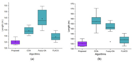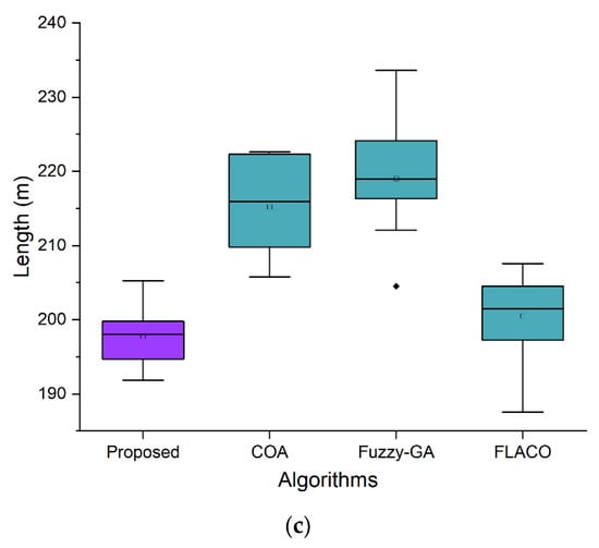 Box plots are the standard graphical representation of the distribution of values in a range. The consistency of the proposed FGDACO was analyzed using standard deviation. The standard deviation of the proposed FGDACO and existing algorithms could be graphically analyzed using a box plot. Figure 14a–c shows the box plots of FGDACO and existing algorithms for all three scenarios. It can be seen that FGDACO exhibited the least variation in the converged length values among the independent runs. It can also be seen that in all three scenarios, the box plots of FGDACO are almost symmetric, without outliers.