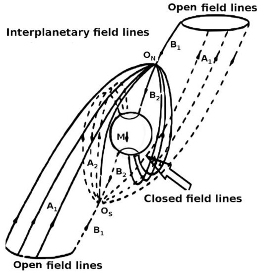 A simple scheme of reconnection of a dipole field, simulating the planet’s own magnetic field, with a uniform magnetic field of the solar wind is shown in Figure 1. Open field lines form northern and southern tubes bounded by the separatrix surfaces A1. Closed dipole-like field lines are placed near the planet and are bounded by the separatrix surfaces A2. The surfaces of magnetic field lines A1 and A2 are connected in the neutral points of the magnetic field ON and OS. Singular magnetic field lines B1 and B2 are perpendicular to the separatrix surfaces in magnetic nulls. B2 lines intersect the ionosphere in the cusp projections [25].